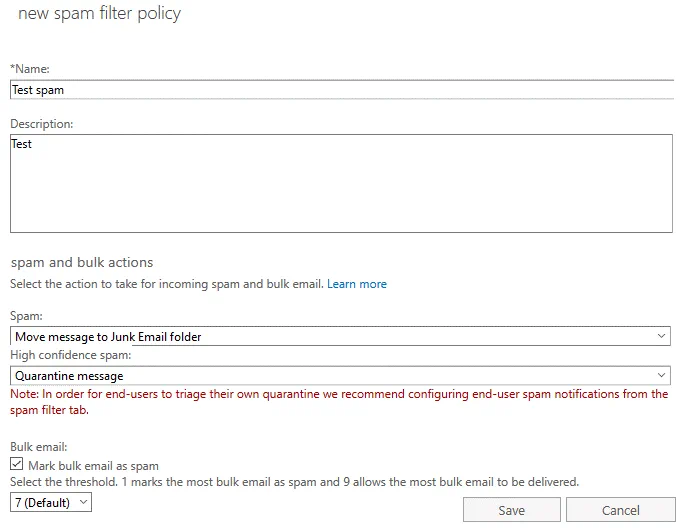 Spam and bulk actions. You can select the action to take for incoming spam and bulk email. Select the Mark bulk email as spam checkbox to disable delivering marketing emails, newsletters and other unwanted messages that are not required for the working process of users in your organization. Select the threshold in the drop-down menu to tune recognizing bulk emails as spam. Spam confidence level uses threshold values that are 1-9 and 7 is the default value.