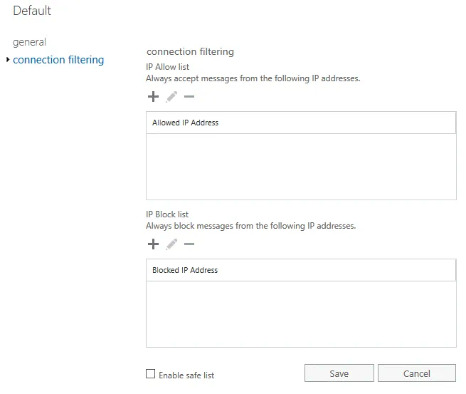 You can select the Enable safe list checkbox to use Microsoft’s safe list of trusted IP addresses. Microsoft subscribes to third-party lists of companies aimed to continuously update whitelists and blacklists of email senders worldwide. If you don’t trust third-party lists, you can ignore this option and not select this checkbox.