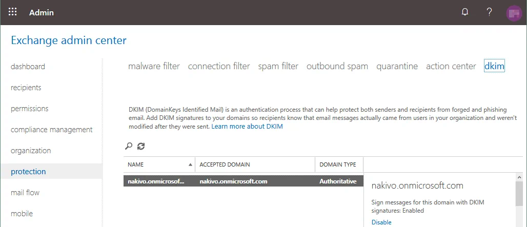 DKIM. DKIM (Domain Keys Identified Email) is an additional method of spam fighting that is based on adding a cryptographic signature (DKIM record) to outgoing emails. The DKIM signature is a header added to an email message and is secured by encryption. On the other side, a destination mail server can determine that an email message was sent by an authorized mailing system. The end user (recipient) doesn’t see the signature. You can find DKIM settings for your domains in the corresponding subsection of Exchange Online Protection settings.