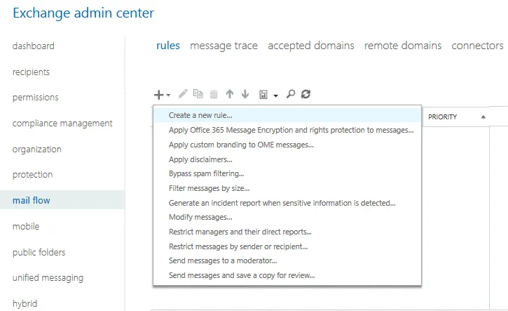 This section allows you to manage the mail flow by using transport rules and conditional mail routing. Mail flow rules (mail transport rules) are used to take actions on messages before they are delivered to the mailboxes of recipients. You can configure a set of conditions, such as attachment size, subject name, and so on, with a comparison operator to set the filtering system to make a decision. For example, if a message subject is “For sale” or “Discount”, this message must be deleted. You can also modify and forward messages. A rule in the top of the list has the highest priority and a rule at the end of the list has the lowest priority. High priority rules are applied first when handling emails in the mail flow.