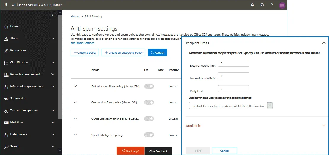 Outbound spam. Some configuration pages were updated by Microsoft and reallocated to other addresses. You can configure spam policies, including outbound spam policies on the page: