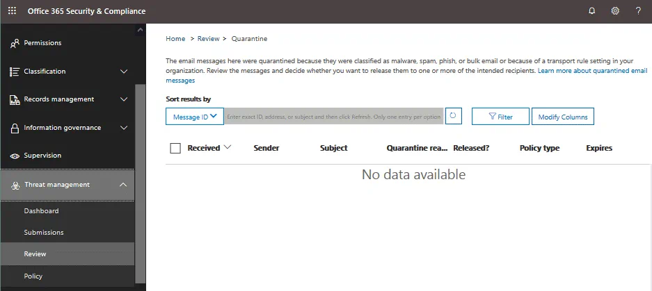 If there are filtered messages marked as spam or malware, you can see them in the list. The appropriate policies (such as spam filter policies) must be applied to store suspicious messages in the quarantine.