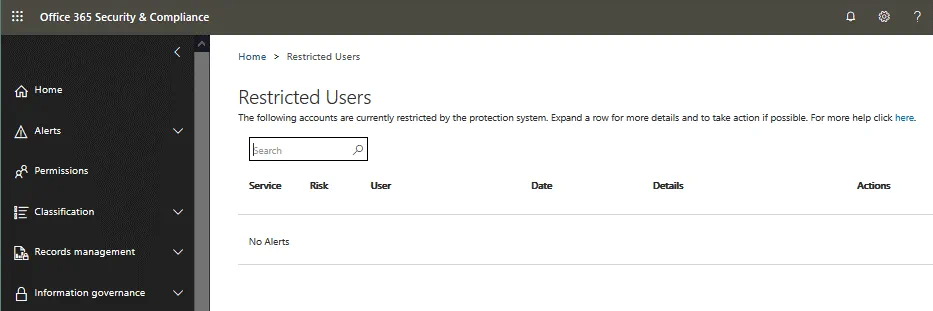 You can see a list of restricted users, actions, services and other action details on this configuration page of Exchange Online Protection.