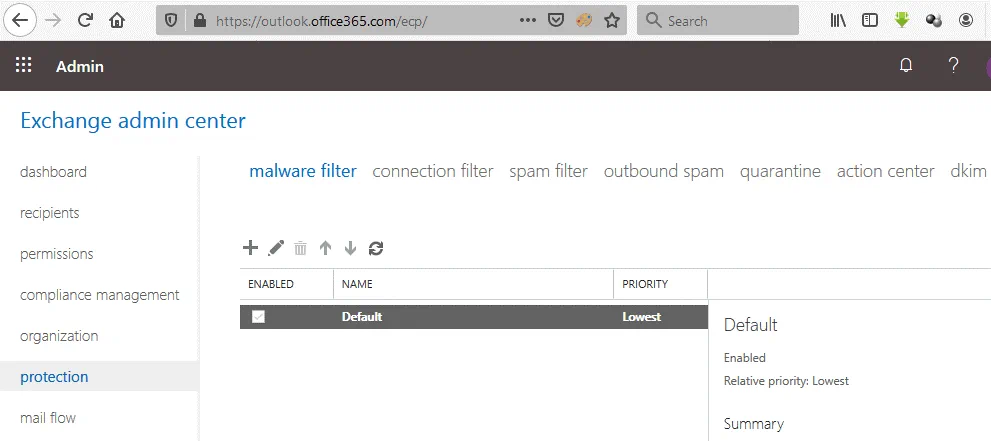 Click protection in the left pane of the Exchange admin center. On the top of the web page, you can see malware filter, connection filter, spam filter, outbound spam, quarantine, action center, and DKIM options. The Protection section is responsible for anti-spam and anti-malware protection.