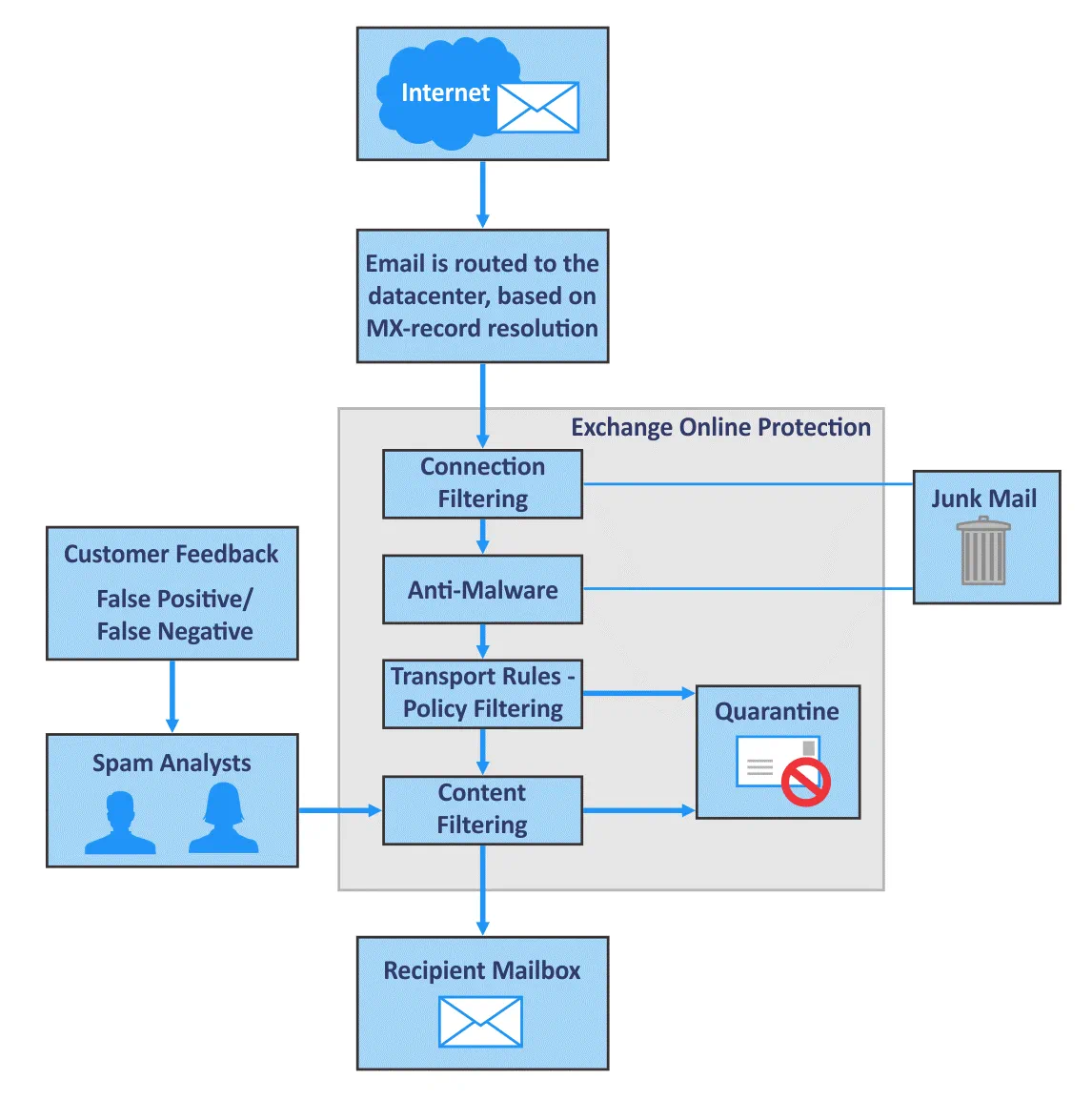 When somebody outside your company sends an email to a user of your organization, the email is routed through a chain of routers and mail servers to your mail server according to MX records configured for your domain. If you use Exchange Online as part of Microsoft 365, your virtual mail server is distributed across datacenters in the Microsoft cloud. Many spam emails are dropped before getting to your Exchange Online email servers. When an email message is delivered to an Exchange datacenter used by your organization, Exchange Online Protection swings into action.