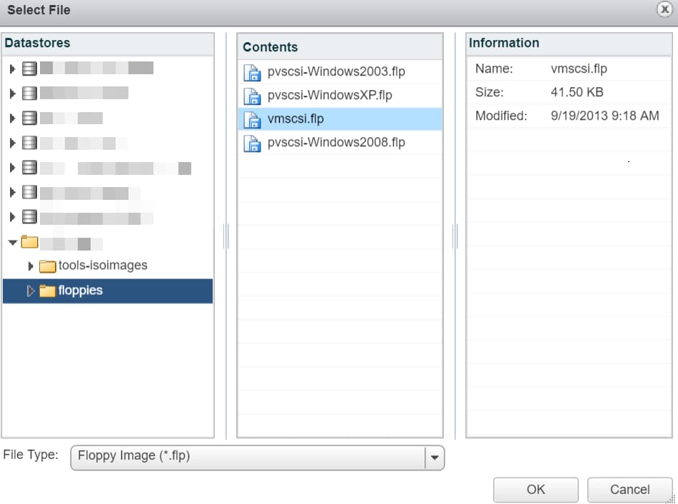- In the Datastore browser window, browse to the destination folder where the .flp virtual floppy disk file is stored, select the .flp image to mount and then click Select.