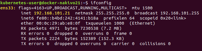 As you recall, the hostname for the first VM that is docker-nakivo21 has already been configured during installation. In order to change the hostname, do the following (this will be needed for configuring the second and third VMs after cloning. Those two VMs are intended to be configured as worker nodes):