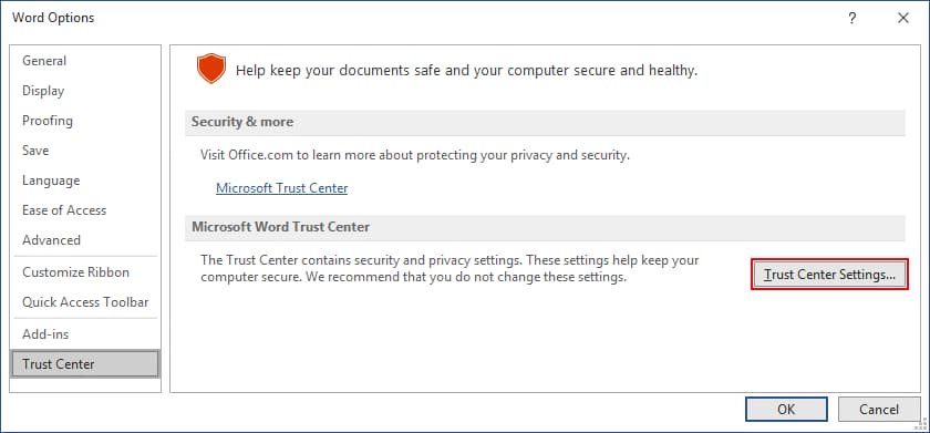 - Select Trust Center in the Word Options window.