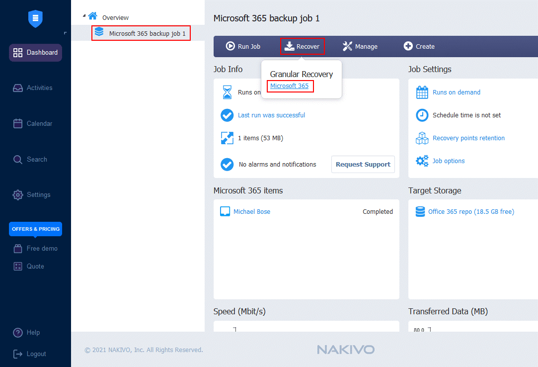 You can make your life easier by using a dedicated Microsoft 365 email backup solution that allows you to back up emails for the needed accounts, recover mailbox folders or emails to a source location or a custom location. NAKIVO Backup & Replication is a data protection solution that combines all these features and contains many additional features to protect Microsoft 365 email data and other Office 365 data. You can back up emails to a local backup repository on-premises, create multiple recovery points, and perform instant recovery of email messages, attachments, folders, contacts, and calendar items. You can schedule backup jobs (to run automatically) or you can run them on demand (manually).