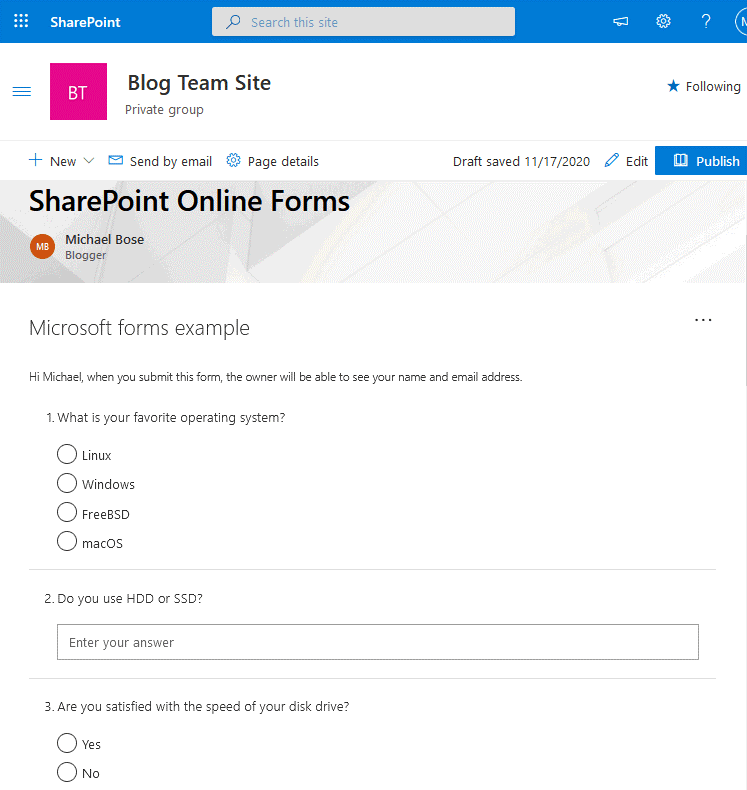 - Go back to the page of your SharePoint site where you inserted a web part with a poll. Check your page, and hit Publish to publish the page (the SharePoint Online Forms in our case) that contains the poll on your SharePoint team site.